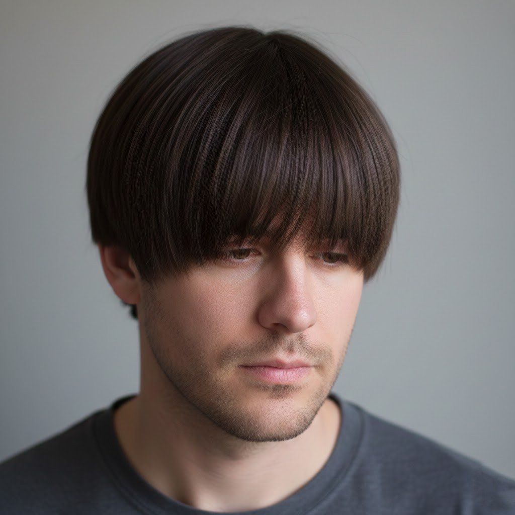 Heavy, straight fringes styled forward recall teenage pop stars. On grown men, they hide confidence rather than enhance it, making their overall look feel immature and overly self-conscious.