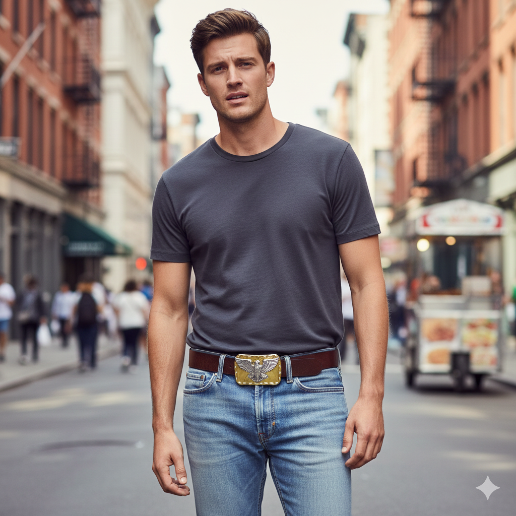 Having a huge, bright belt buckle looks cheap and draws bad attention to your middle. Just wear a classic leather belt instead. A small buckle that isn’t too flashy will look much better and more subtle on you.
