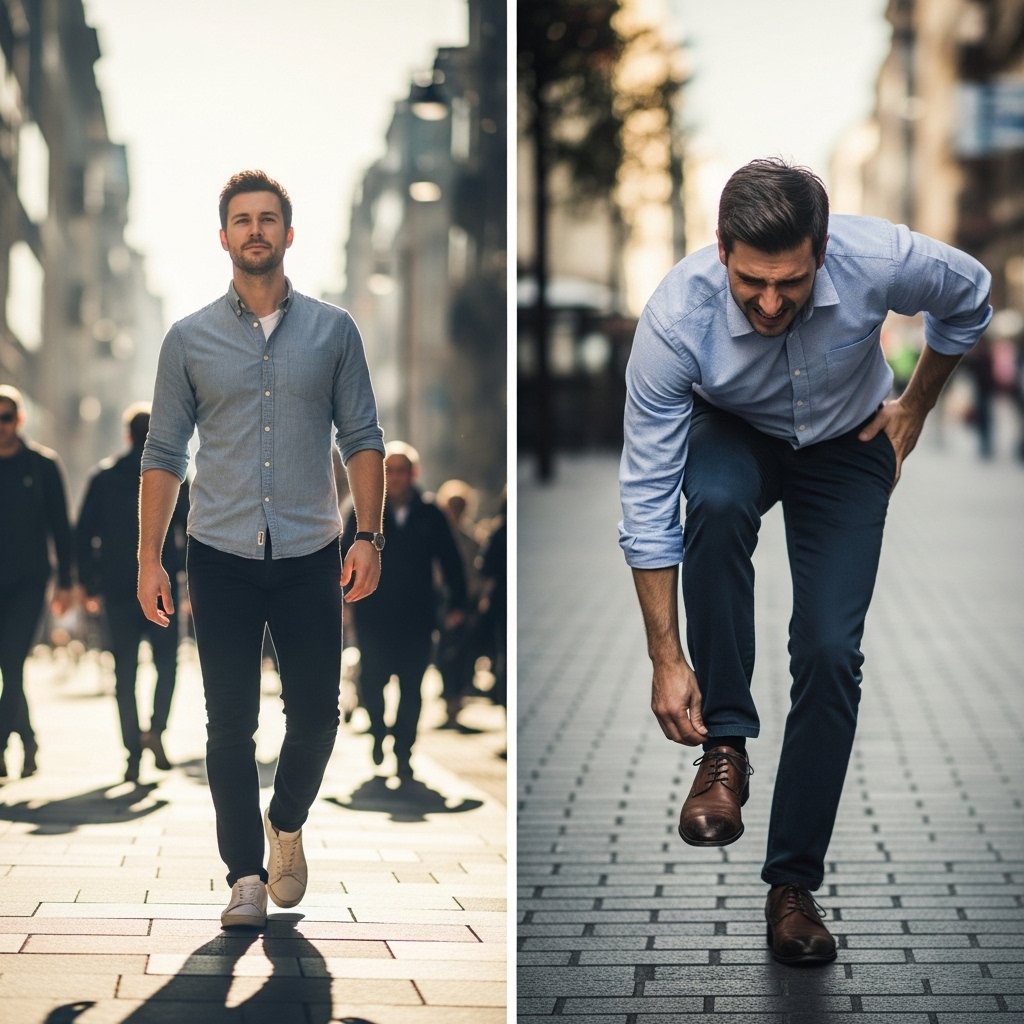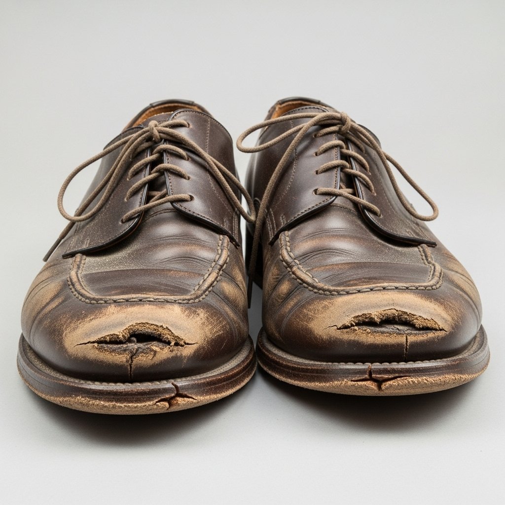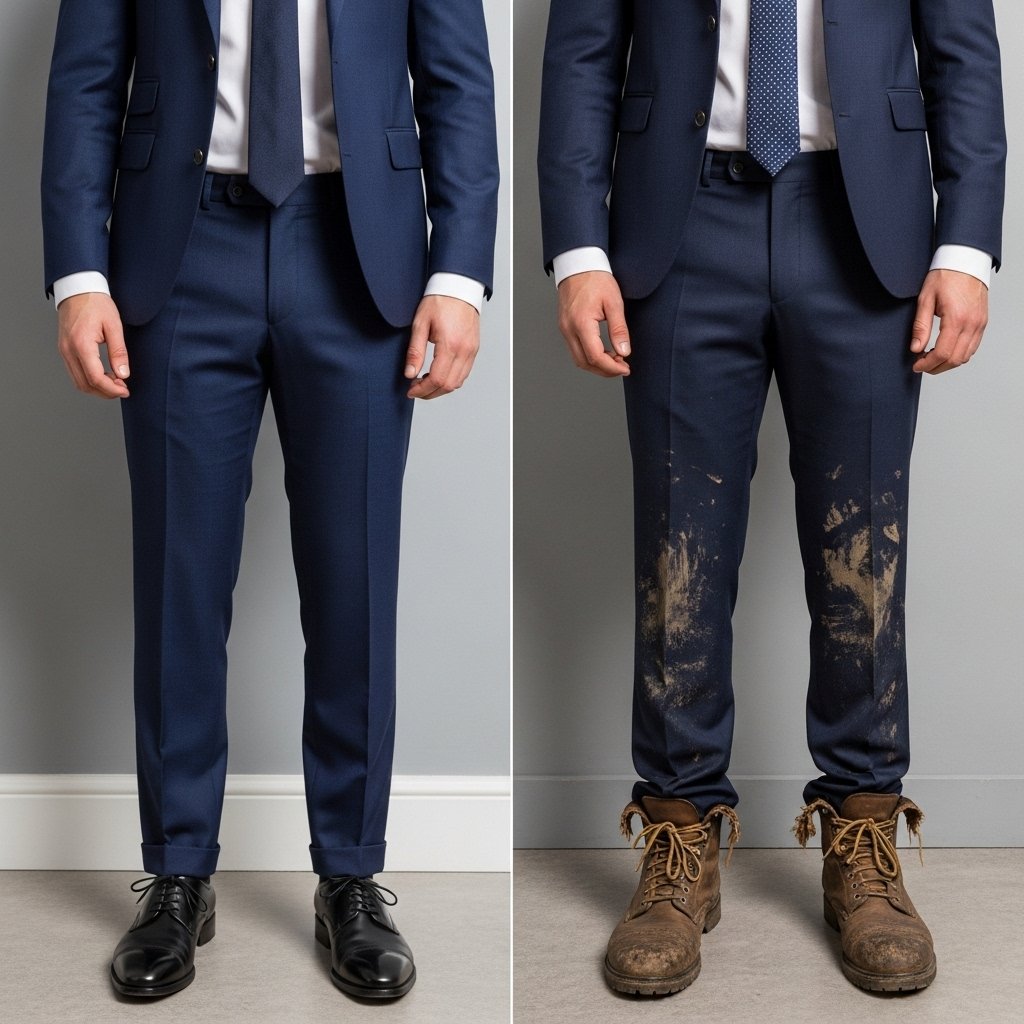 The visibly worn shoes indicate negligence even where the rest of the outfit appears clean and deliberate. Flattened soles, broken leather and unwoven edges instantly reduce the perceived effort and discipline. Before the stage of wearing the shoes reaches this point, it will help to have new shoes in place to save your overall appearance.