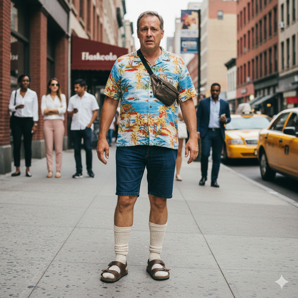 The ultimate “I gave up” combo. Comfort is great at home, but outside? It kills any polish you’ve built. High-value men opt for no-show socks with loafers or proper slides if they want easy – feet stay covered or styled, not on display like a tourist dad.