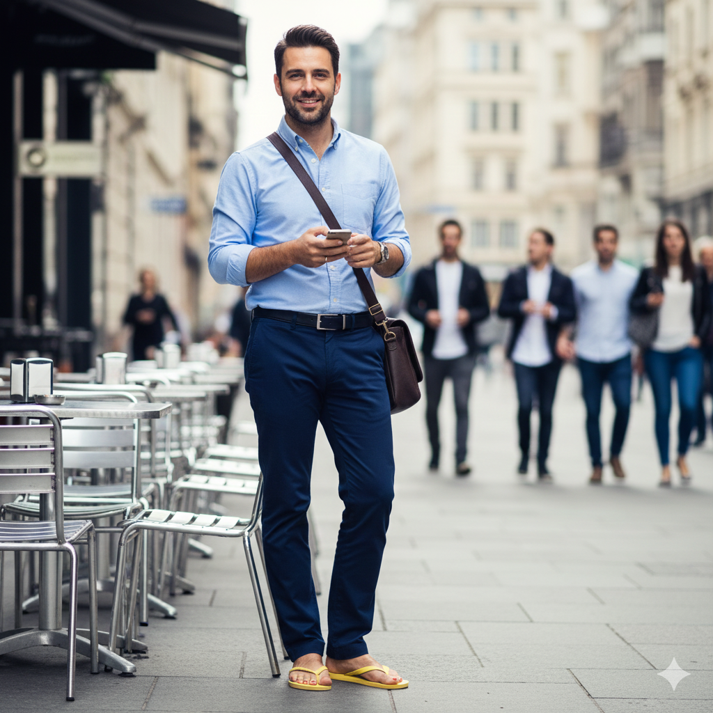 Sure, they’re comfy for sand or the locker room, but slapping around town in rubber thongs? It kills any polished vibe instantly. They go for leather slides, espadrilles, or proper sandals – feet look intentional, not like they forgot shoes exist.