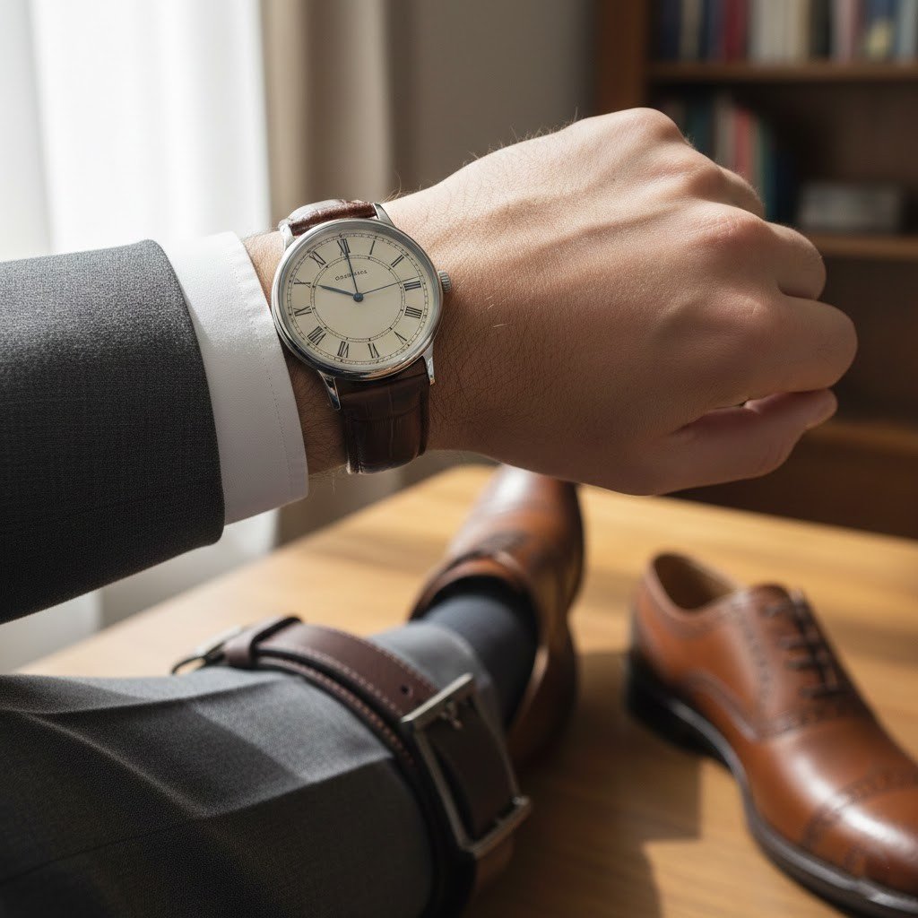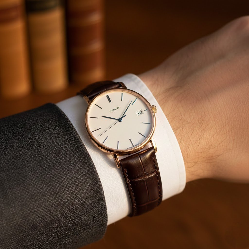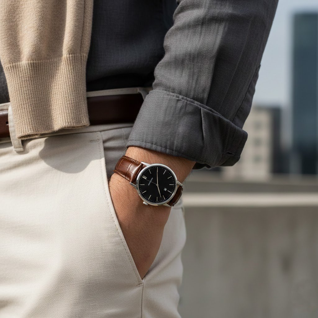 Leather strap watches offer a softer look, and brown or black straps add warmth and texture. They work especially well with clean shoes, belts, and layered outfits. They give a coordinated outfit feel, which is why many gentlemen prefer them at a glance.