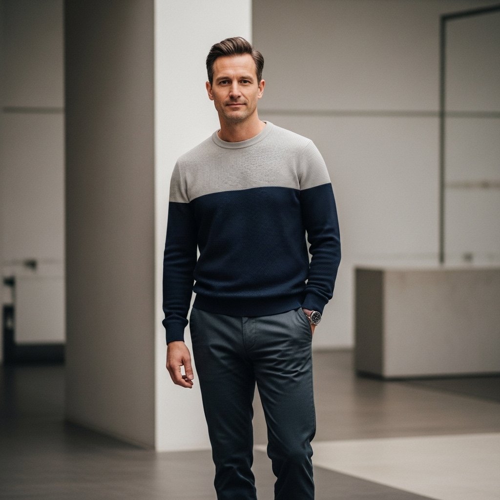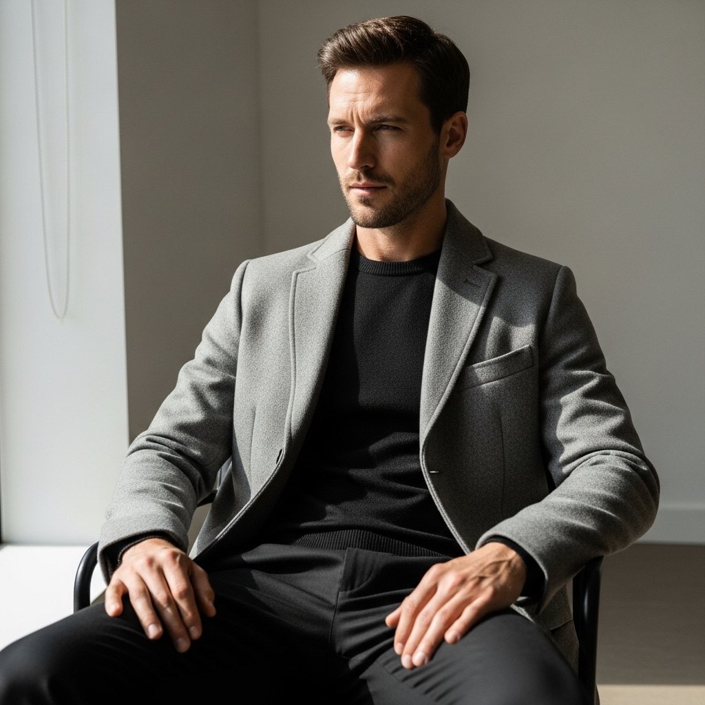 Strategic layering, e.g., a fitted sweater beneath a tailored coat, is dimensional but not bulky. The depth is created with thin layers that are arranged in a structured manner with a streamlined silhouette.