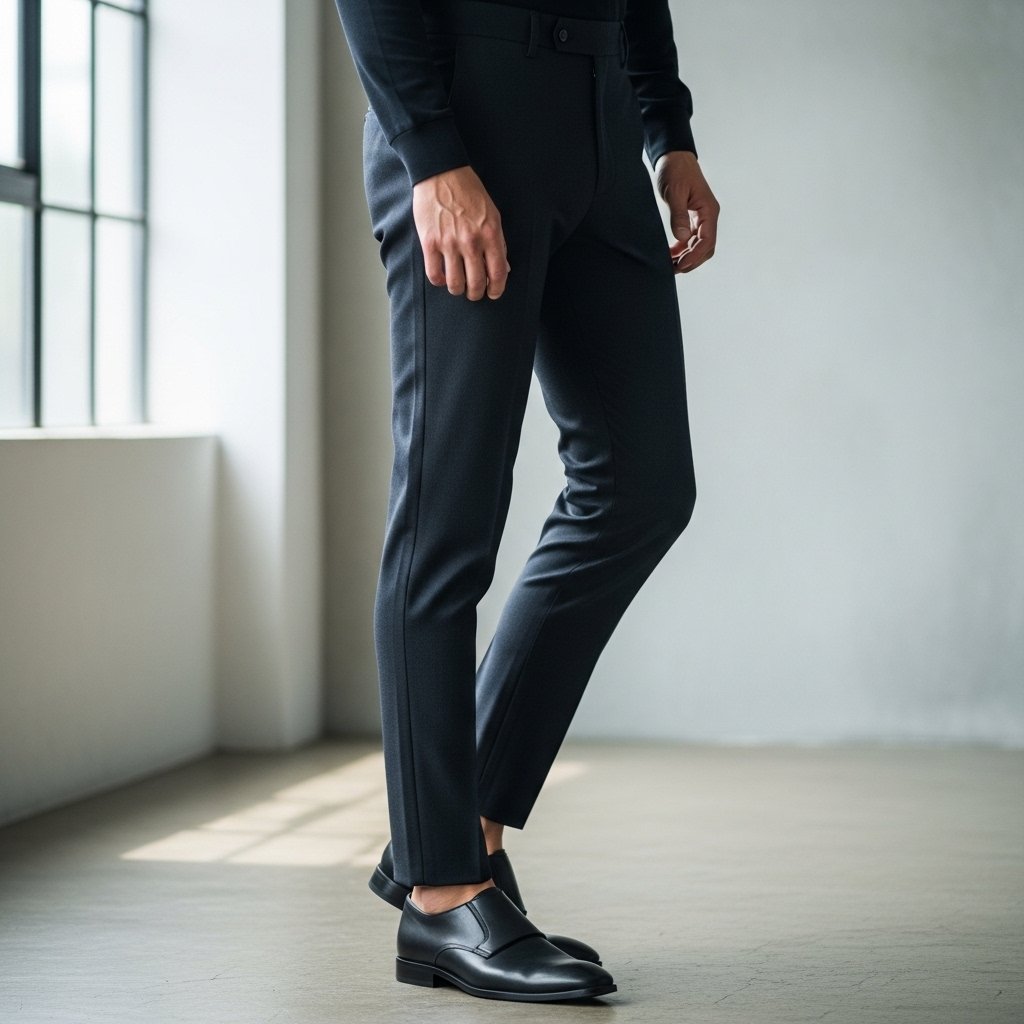 The pants, which barely strike the shoes on the tops, leave a clean cut. There is a small gap that does not clutter the eyes and strengthens an uncontaminated vertical motion.