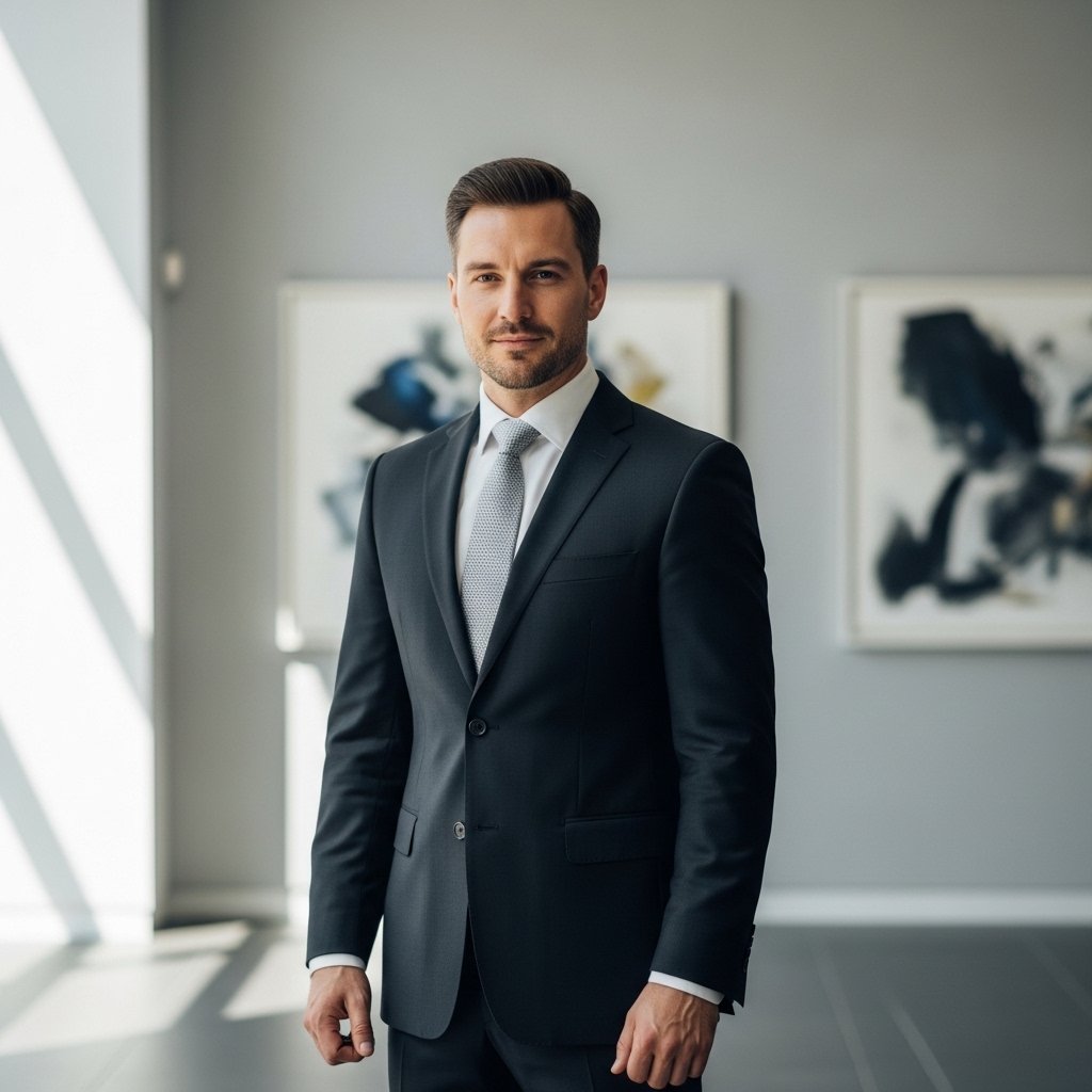 Chiaroscuro trousers and a bit lighter tops bring the entire outfit down to earth and highlight the stature. This contrast maintains the focus on the face and shoulders upwards, enhancing perceived leadership.