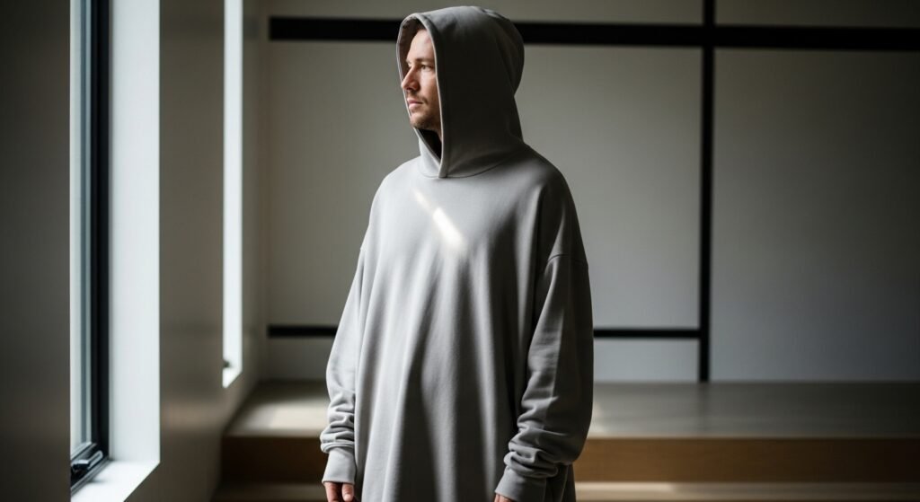 Shapeless and loose hoodies give out a dishevelled appearance. Their presence takes the definition away from the upper part of the body and floods the frame. Fit is not compromised to achieve comfort. Structured hoodies are warm and presentable.