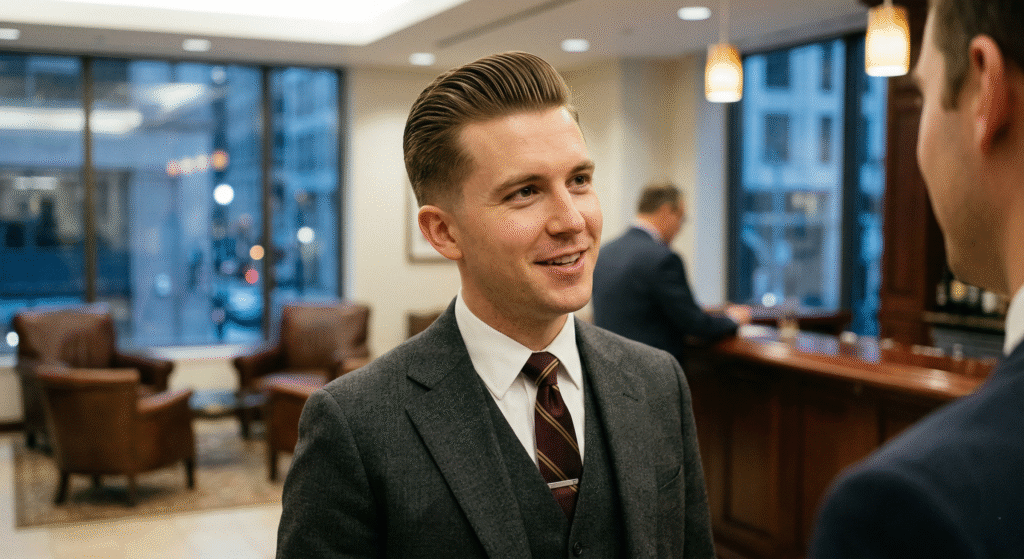 This polished appearance establishes a classic look which reproduces the hairstyle of 1950s movie stars. The professional hairstyle displays a clean taper on the sides while maintaining enough top length for neat combing which creates an image of professional success and sophisticated appearance.