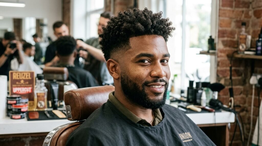 Men who have natural curls now choose to show their curly hair texture. The hairstyle maintains extremely short sides through a low fade, which directs attention toward the defined curls at the top to create a neat appearance that shows off natural hair.