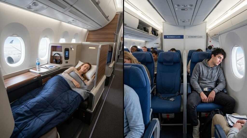 This is where business class will not argue. Lie-flat beds are not luxurious -they are an efficiency aid. Economy seats actually lean back about three inches, which is basically a favorable hint of relaxation. Business class provides a full-flat surface and the possibility to come out appearing like a human being instead of a crumpled piece of paper.