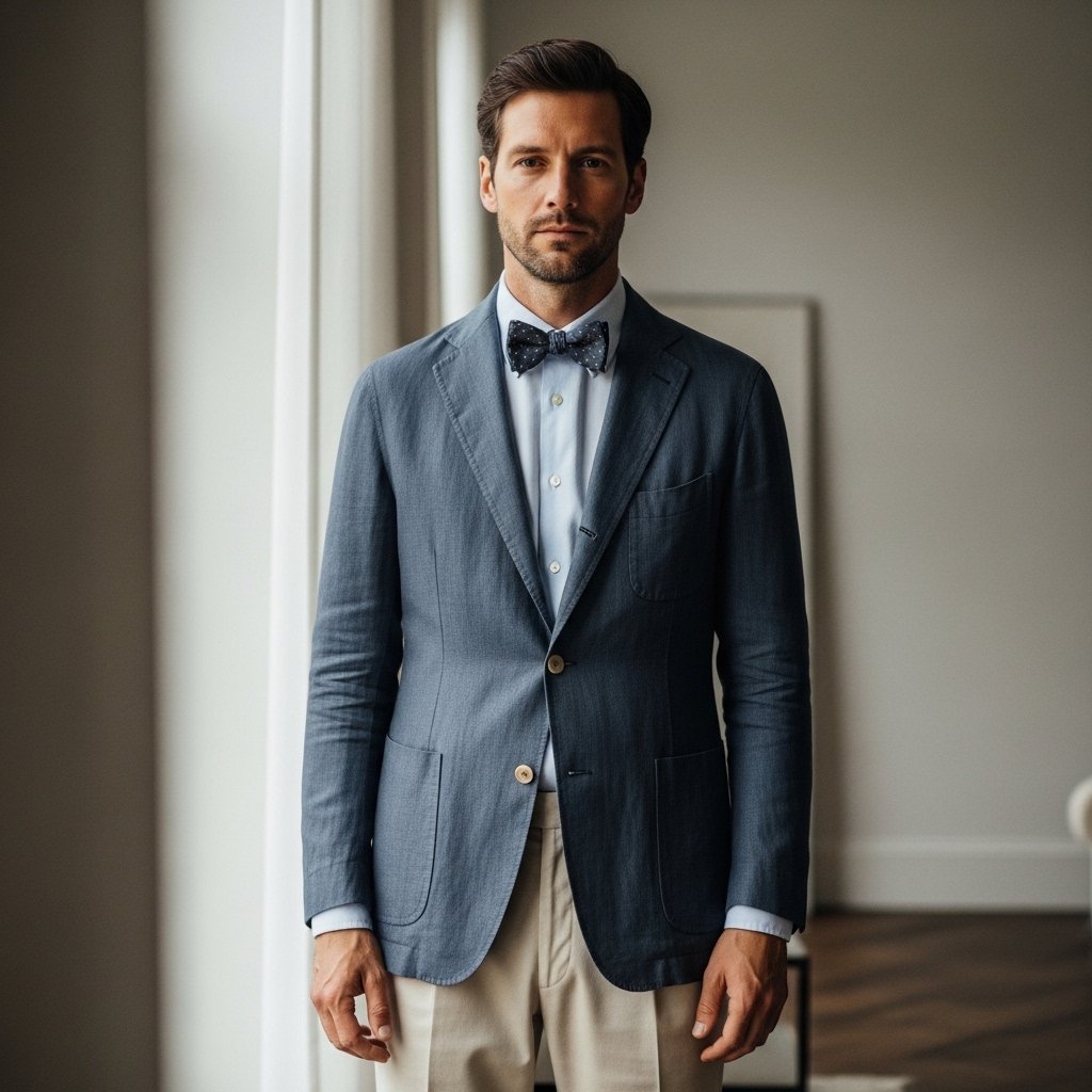 Cotton, linen or light wool jackets are unstructured, therefore they look very nice with bow ties since they do not seem or feel stiff or ceremonious. With the jacket being loosely fitting and without much padding, the whole outfit becomes friendly, which proves that bow ties can be used in the environment where traditional dresses are not required.