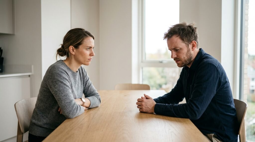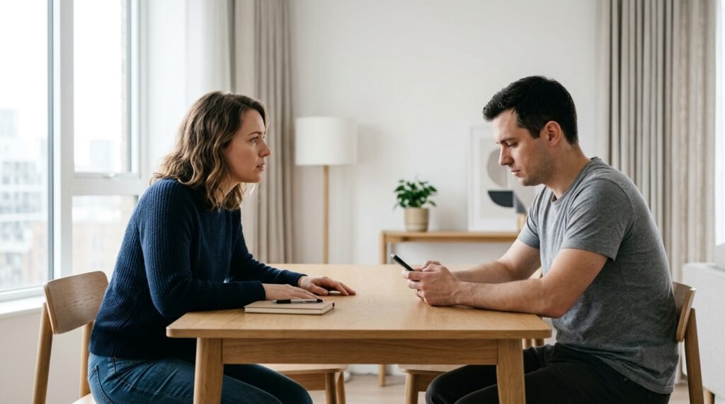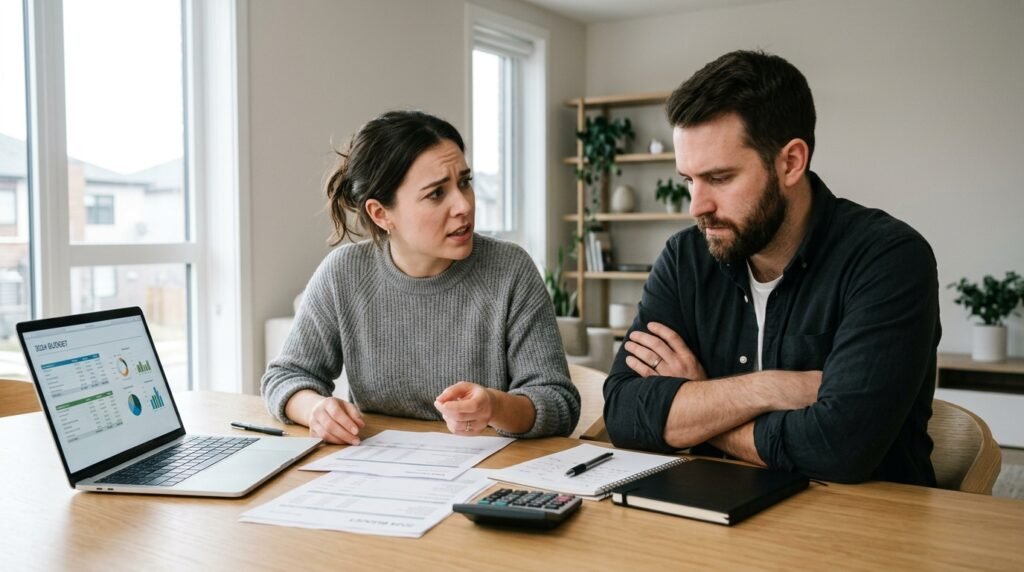 People need to discuss their financial plans before they can create shared budget strategies. His spending patterns remain secret while he avoids discussing shared dining expenses which indicates his spending patterns need to become open to everyone.