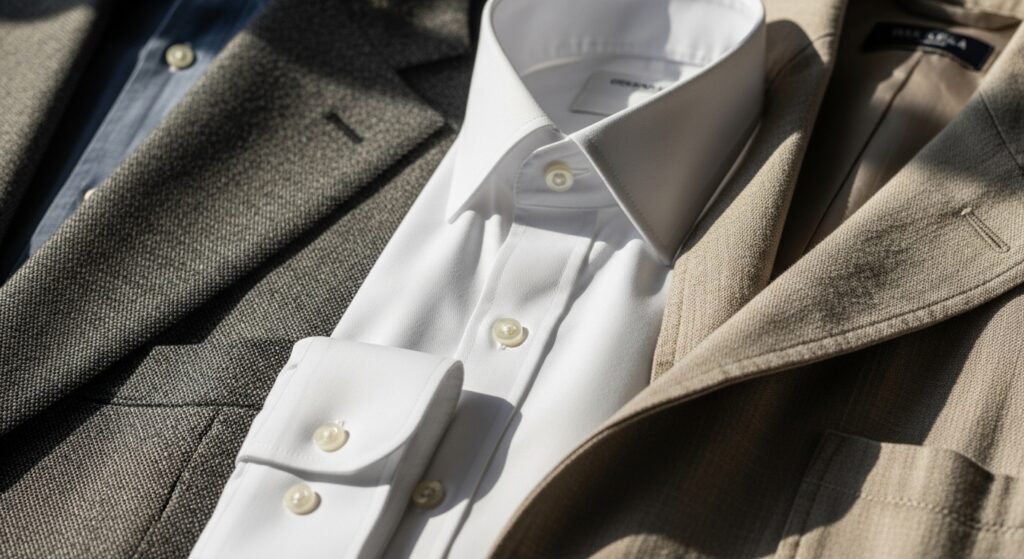 The texture and weight of fabric influence how clothing drapes, moves, and photographs in different lighting. Natural fibers like cotton, wool, and linen often maintain structure and breathability, which helps garments look sharper throughout the day instead of wrinkled or worn out.
