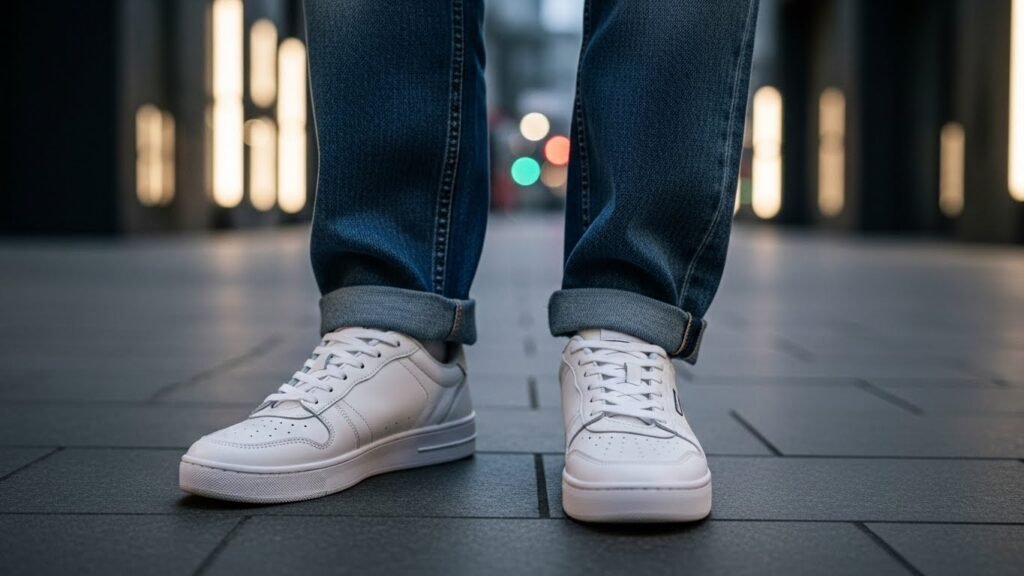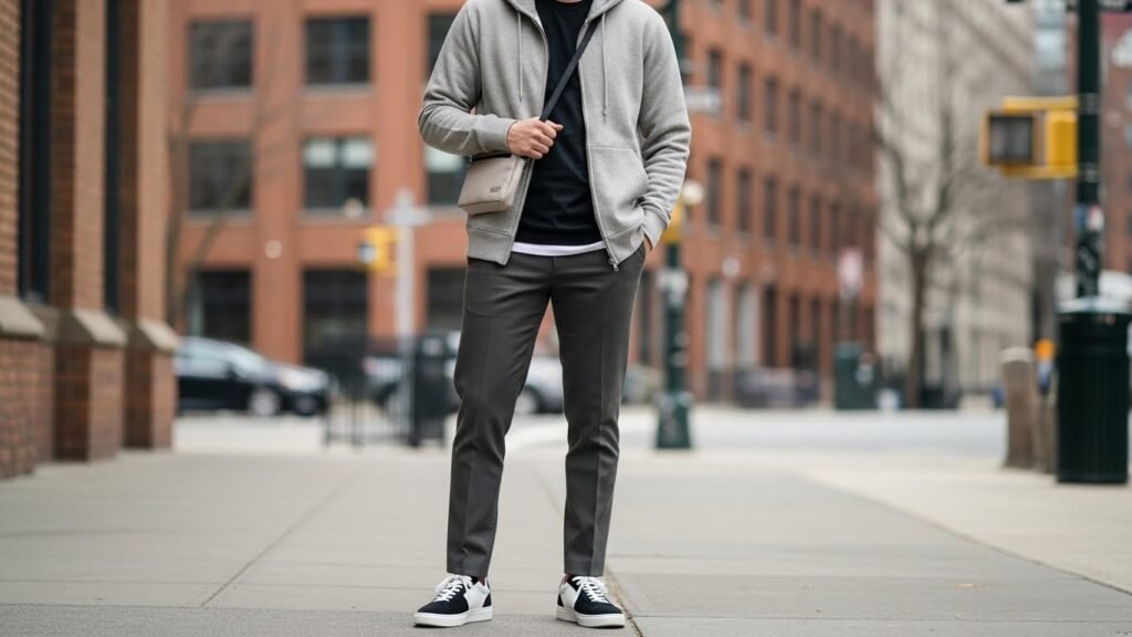 Clean grooming is appropriate with streetwear. The hair and simple shoes are styled neatly and make the outfit high. Casual clothes are made formal through grooming. It completes the look.