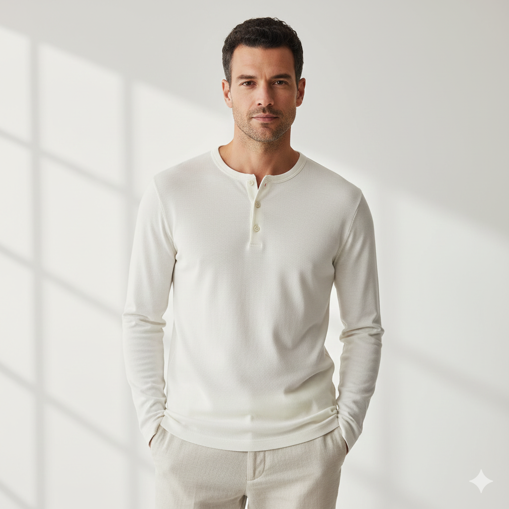 Bright white is too strong sometimes. Cream or Off-White is a softer pick. This color makes your clothes look warmer and more expensive instantly. An off-white henley shirt is a great, simple style boost.