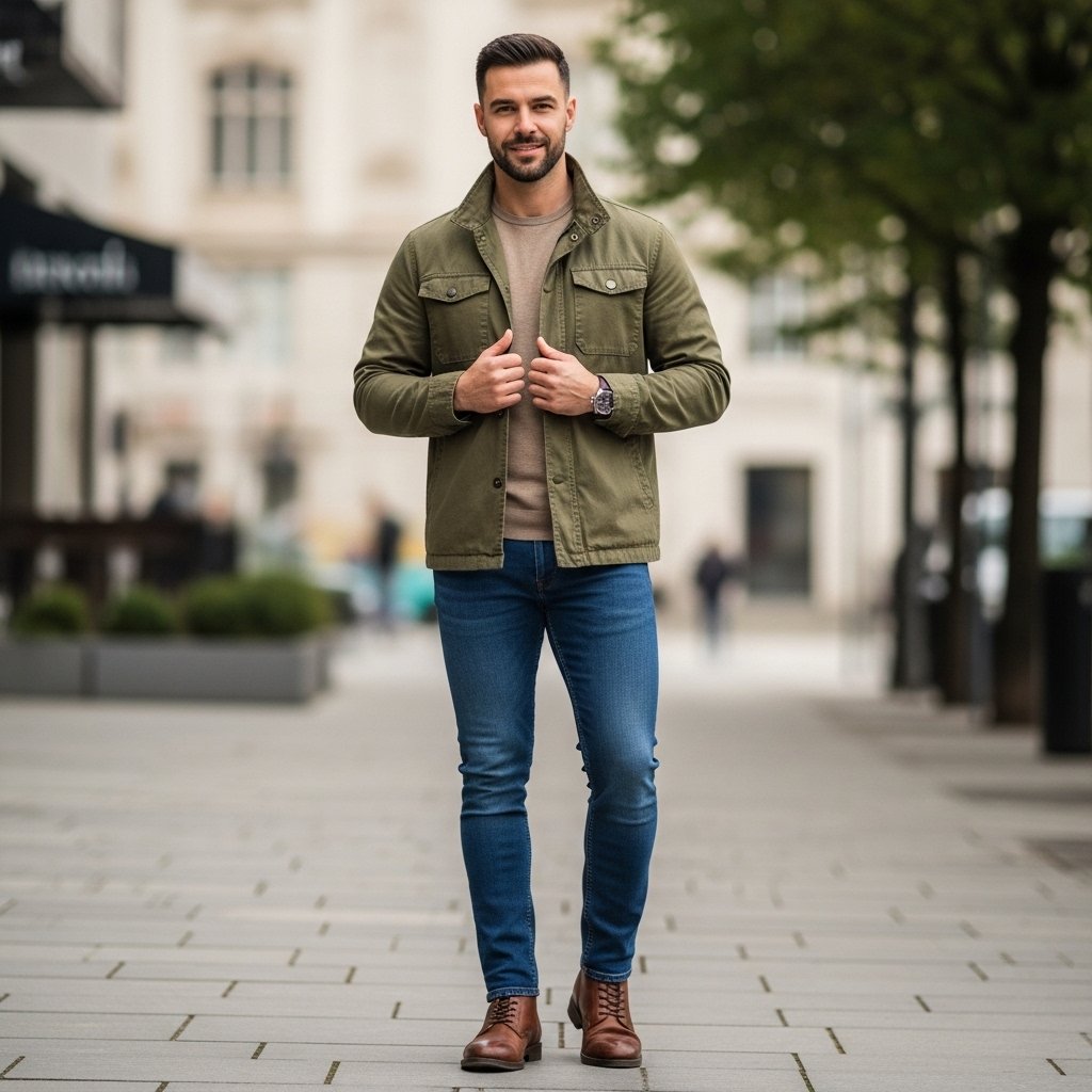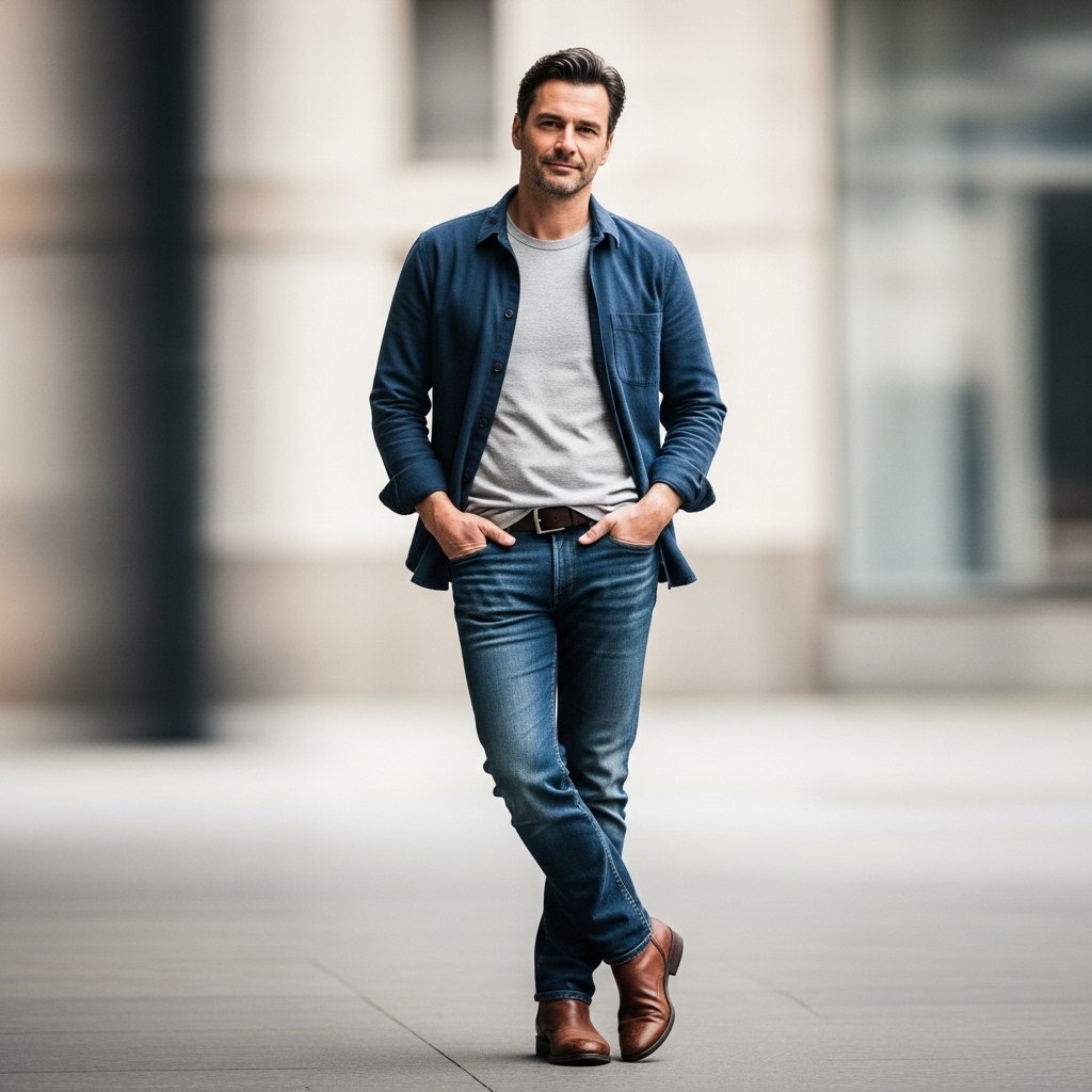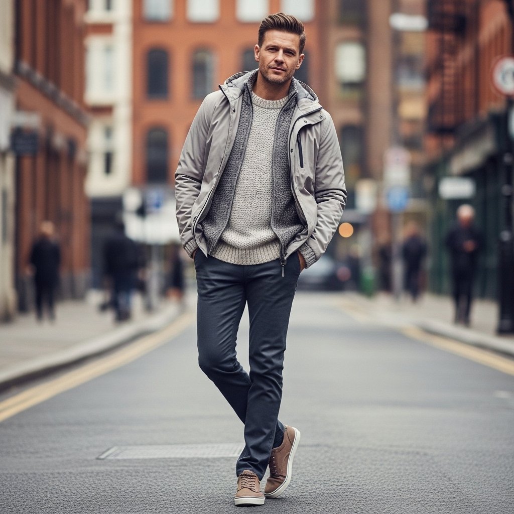 Footwear functions as the foundation for every outfit. Simple, well-maintained shoes elevate even casual looks. The combination of clean sneakers with loafers and leather boots delivers the ideal mix of casual and formal appearance.