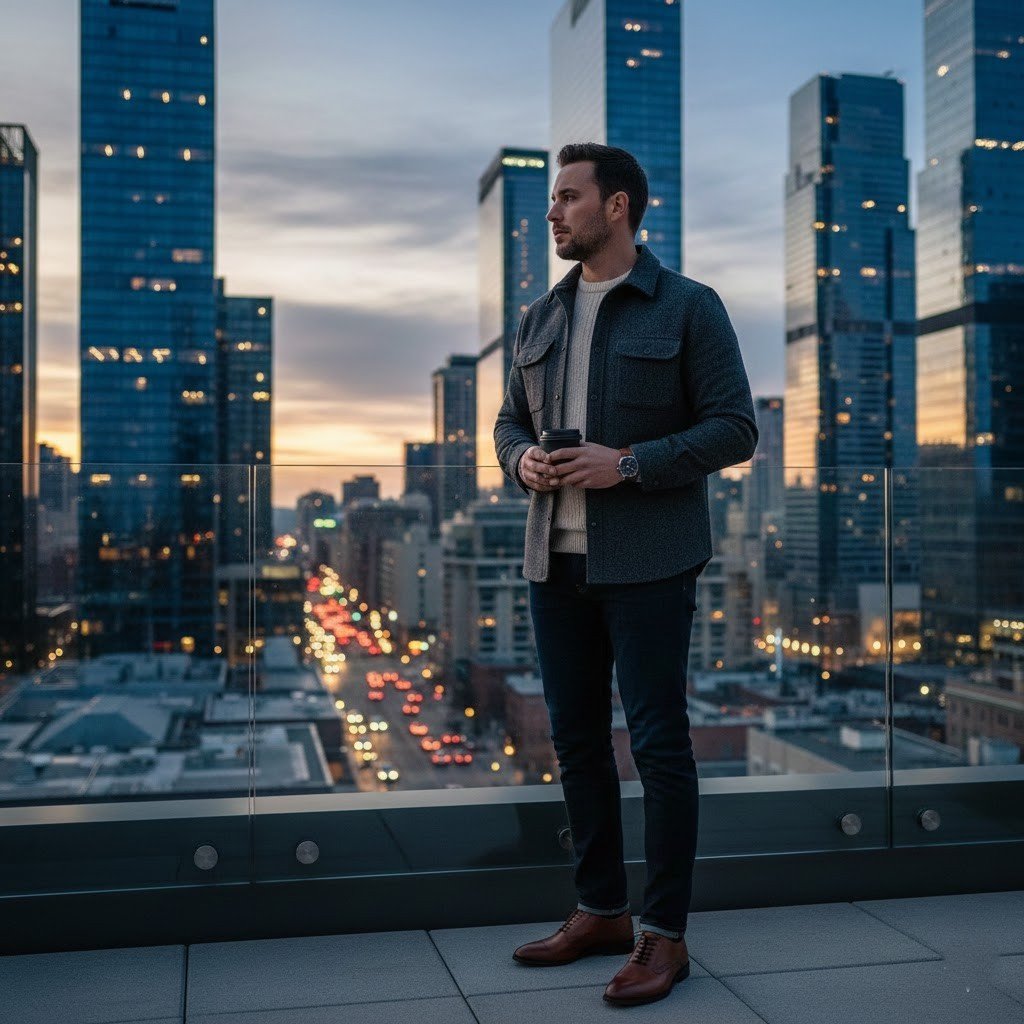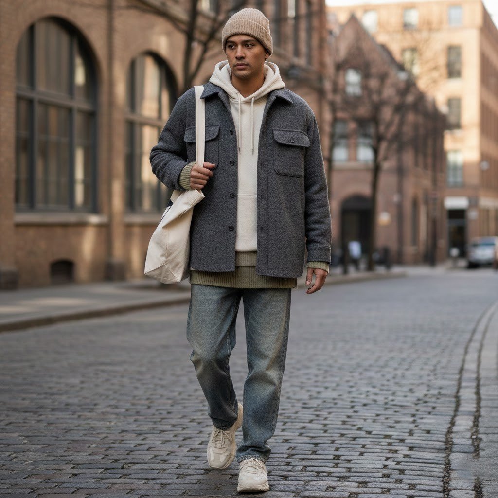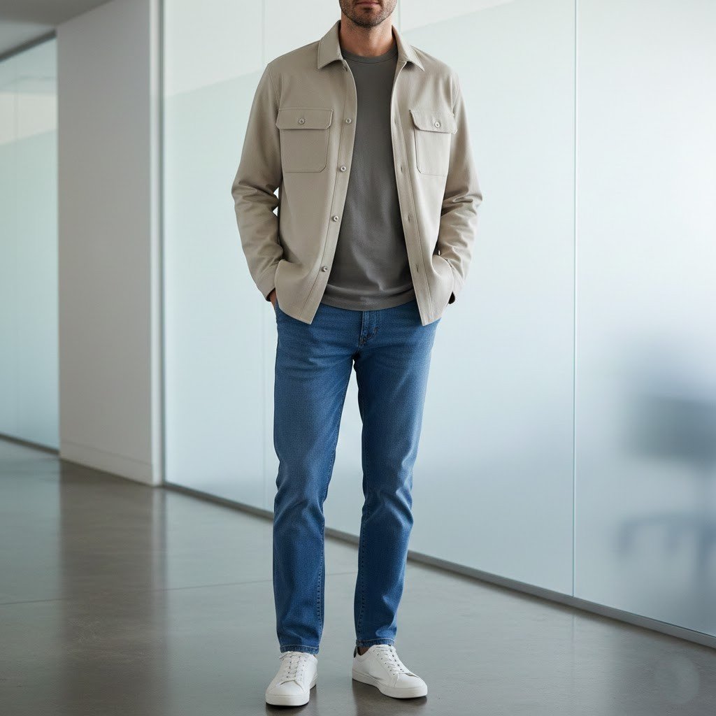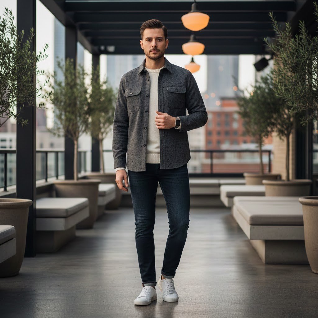 These shirt jackets are a bit fancier, and they go well with clean sneakers or leather shoes. Darker shades like charcoal or deep brown look refined and create a good impression at a glance.