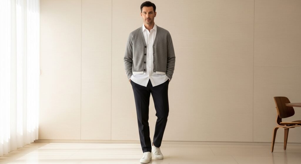 Before you pass on– listen to us. The abbreviated cardigan is no grandfather Sunday afternoon television friend. It fits over a button-down or a plain tee; it provides the equality of either a jacket or a coat, yet it is not so heavy that it becomes bulky. It is an indication that you know a good proportion, and proportion is what any really self-possessed outfit is based on.