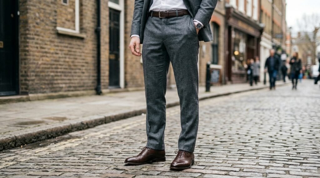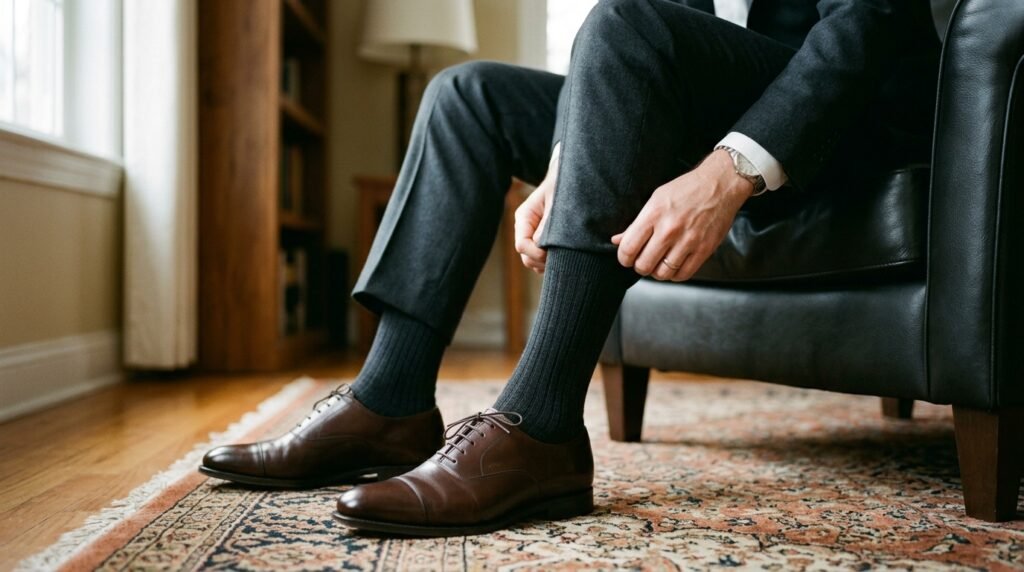 White athletic socks must not be worn with dress shoes or boots. Choose dark crew socks that match your trousers and the fabric covers white areas which creates a smooth appearance without any sudden white patches appearing when you move your legs.
