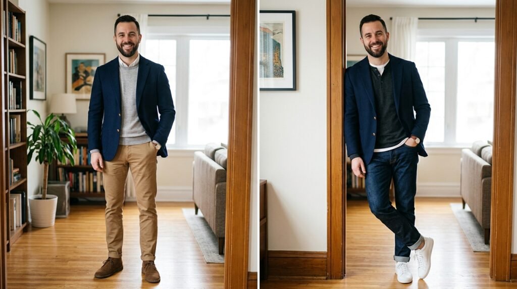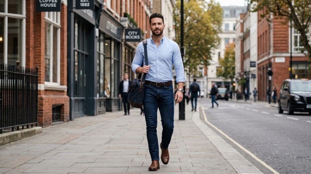 Replace your ripped or oversized jeans with a pair of slim-fit or straight-fit jeans that have a deep indigo color. Dark denim provides a cleaner appearance which resembles expensive items while allowing users to achieve formal dress code standards through button-down shirt combinations.
