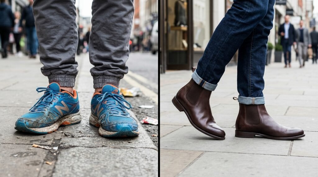 People notice shoes first and this transition from damaged athletic sneakers to clean white leather minimalist sneakers or Chelsea boots shows that you place value on how you present yourself.