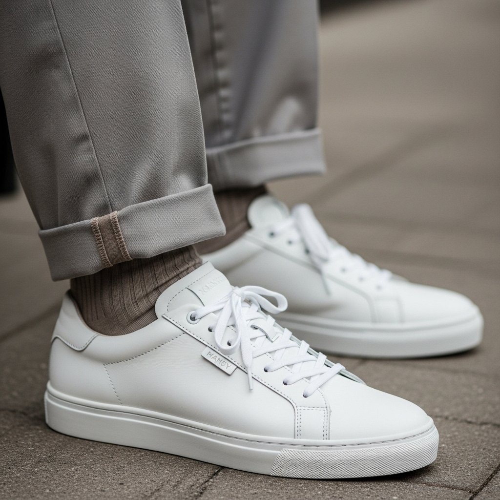 Minimal sneakers are comfortable and do not ruin the style, particularly white or in neutral colors. They serve as an addition to casual and smart-casual clothes being a good option of men who are always on the go.