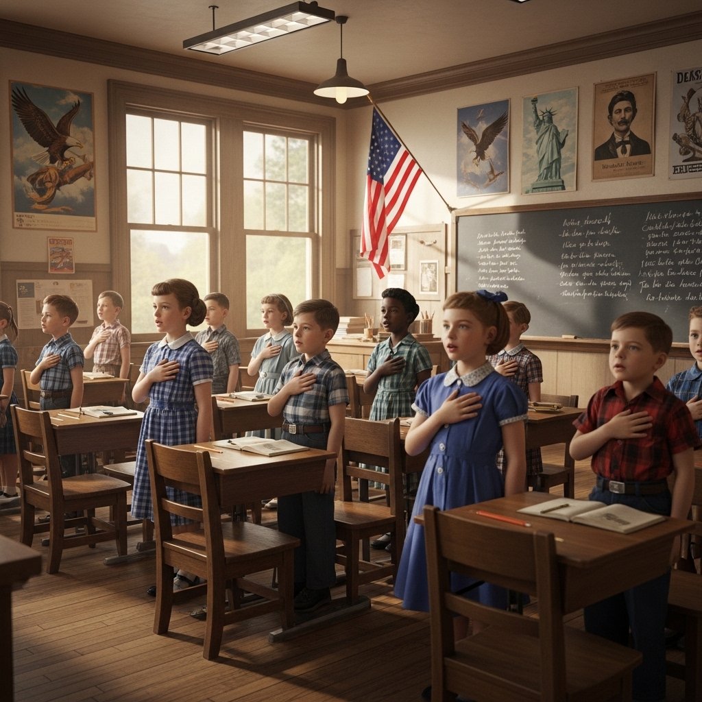 Schools had a high emphasis on patriotism during the Cold war period. There were regular flag ceremonies and recitation of the Pledge of Allegiance by the students. The national issues at the time were also related to lessons, which emphasized American history and civic responsibility.