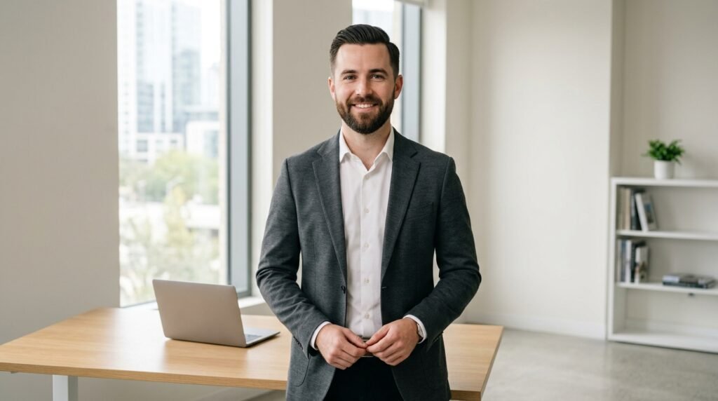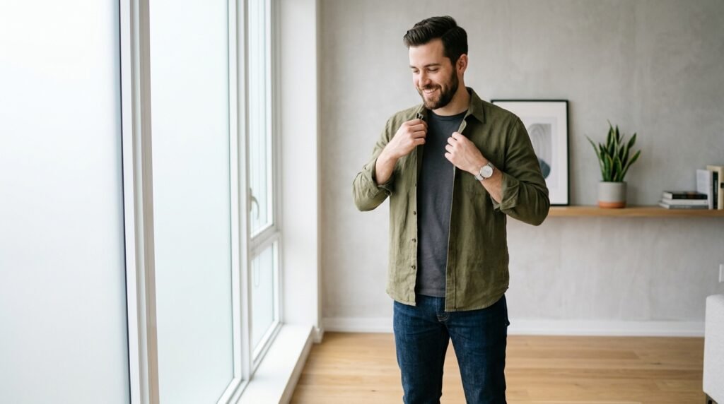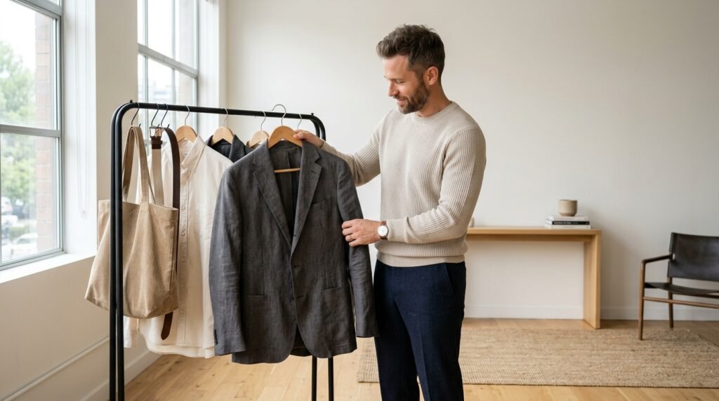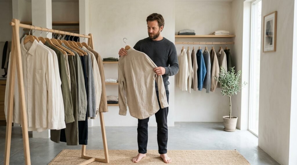 Clothing made from hemp and organic wool and recycled materials serves as a primary environmental responsibility indicator and the man demonstrates his environmental awareness by choosing high-quality items instead of fast fashion disposable products.
