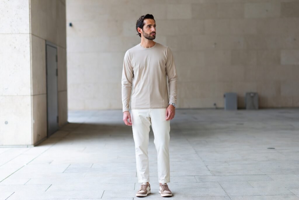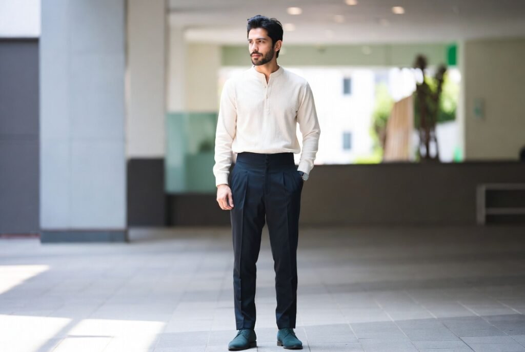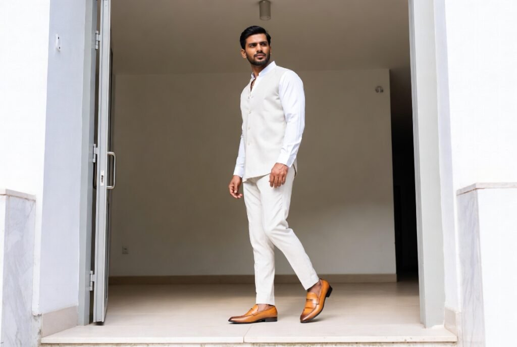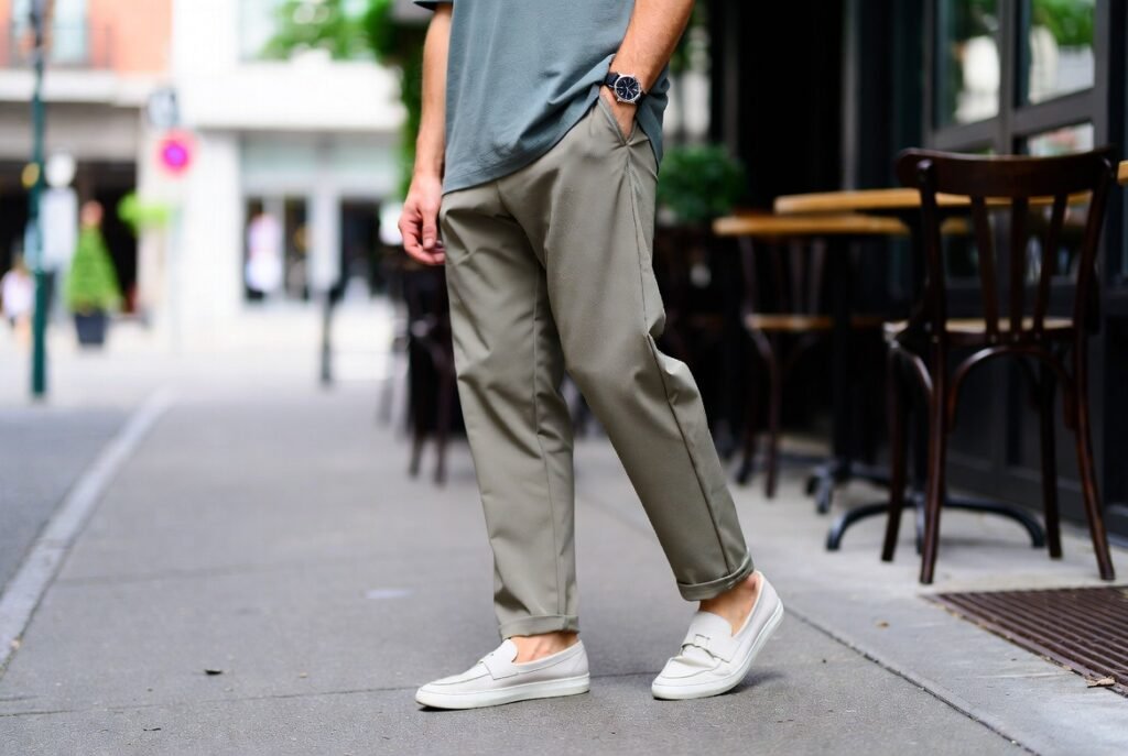 Casual shoes do not lack structure to appear purposeful. The relaxed outfits are not sloppy with clean lines. Nike sneakers or plain loafers will go with numerous outfits. Excessively sporty or scuffed ones diminish polish. Formality is less important than balance.