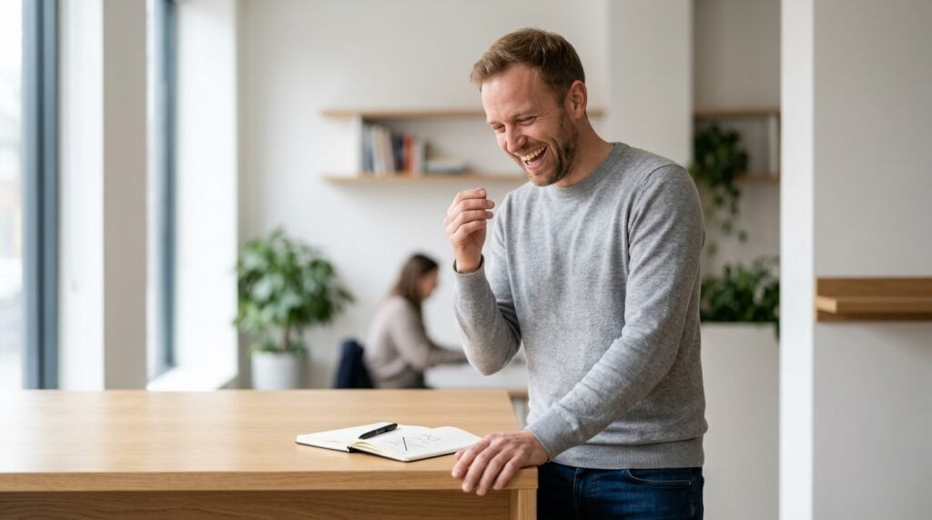 The skill of self-laughter demonstrates powerful self-assurance and the man uses humor to make fun of himself after he commits a minor error because he understands how to handle himself around others.